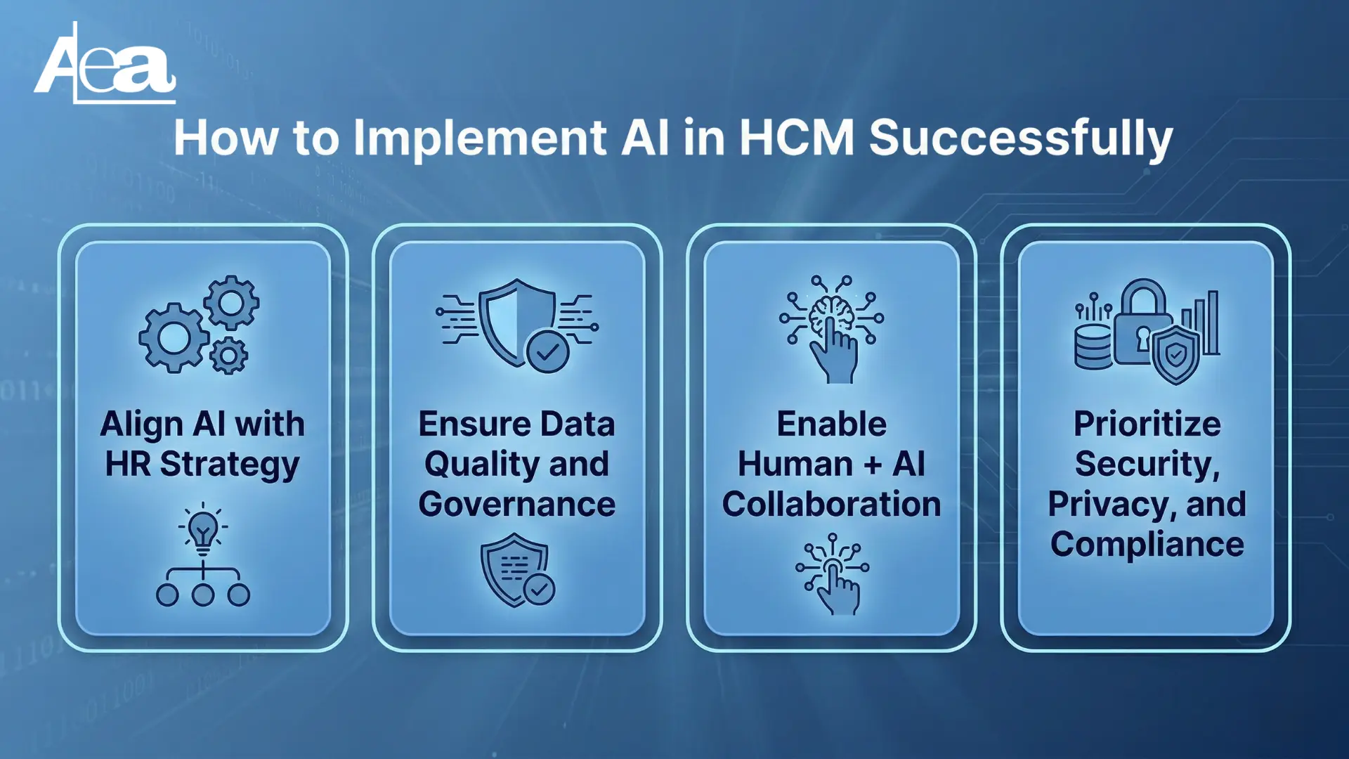 AI in HCM should augment HR professionals, not replace them. Train HR teams to interpret AI insights, validate recommendations, and apply contextual judgment. Encourage adoption through upskilling and change management programs.