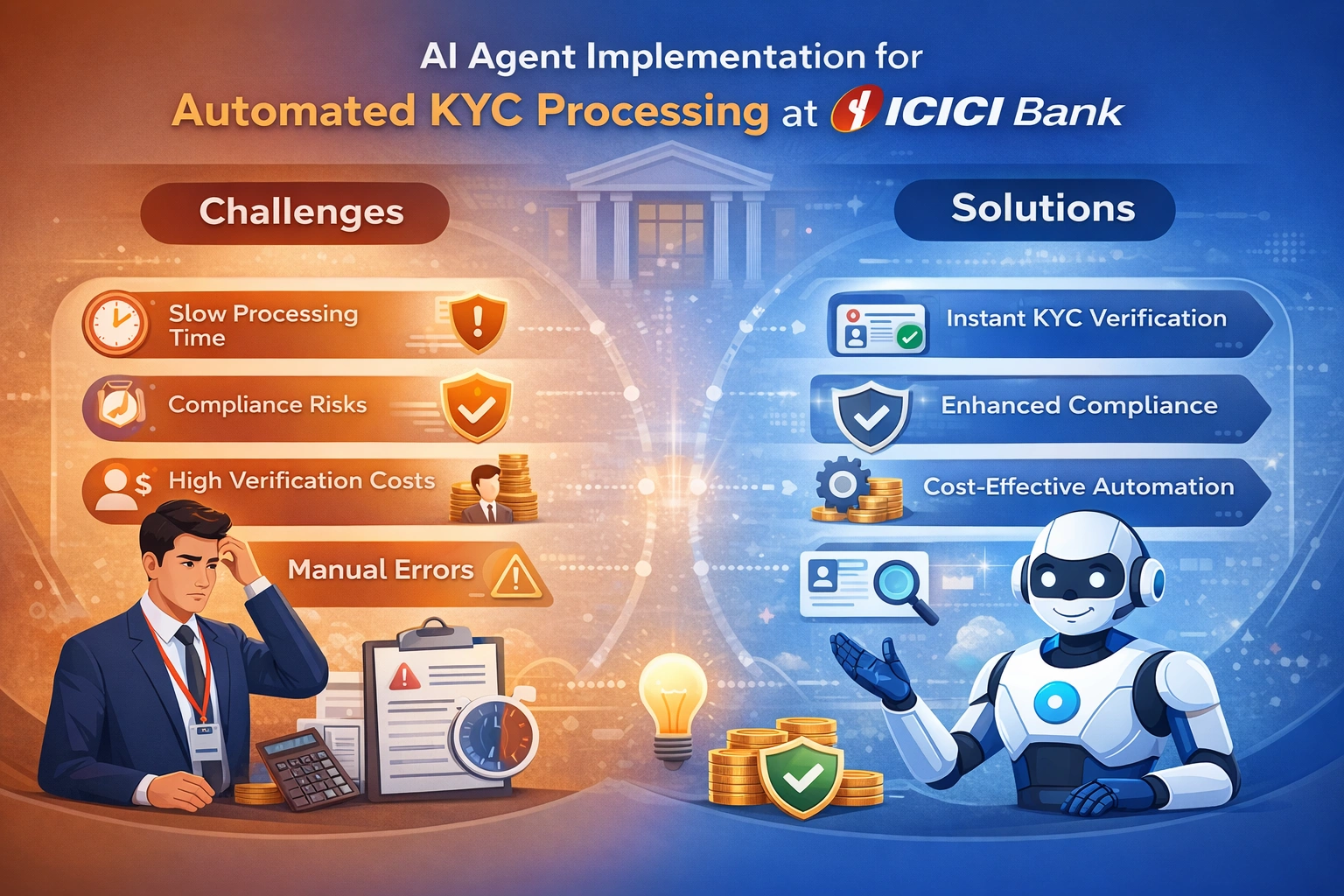 This project focused on implementing a scalable and secure AI Agent-based KYC processing system for ICICI Bank. The platform automates end-to-end customer onboarding, including document verification, identity authentication, and compliance checks. By integrating advanced AI technologies such as OCR, facial recognition, and risk-scoring algorithms, the system significantly reduces processing time while improving accuracy and fraud detection. Cloud infrastructure ensures high availability and scalability, while real-time analytics provide actionable insights into customer verification workflows and compliance metrics.