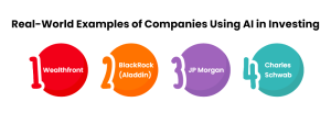 These companies illustrate that AI is no longer an optional tool it is the backbone of modern investing. From robo-advisory platforms like Wealthfront to institutional solutions like Aladdin, AI enables faster decision-making, better risk management, and more personalized investment strategies.