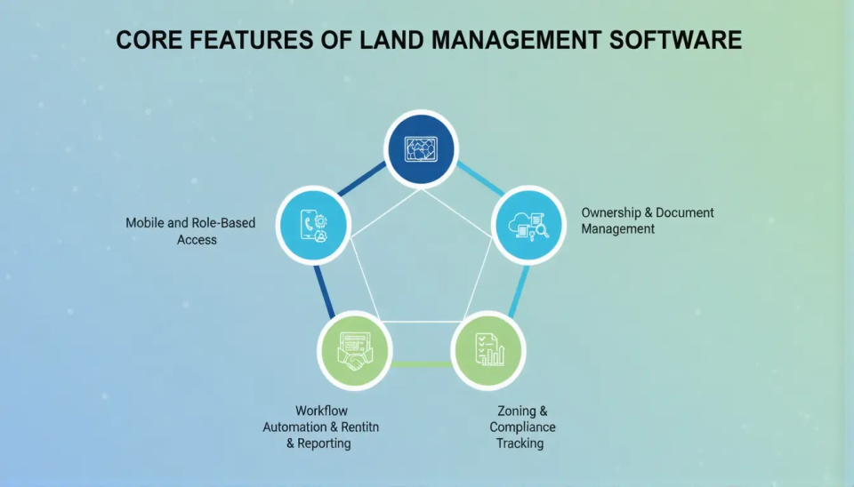 Land management software enables organizations to digitally record, monitor, and manage land-related data such as ownership details, zoning information, land use, and spatial boundaries from a centralized system.