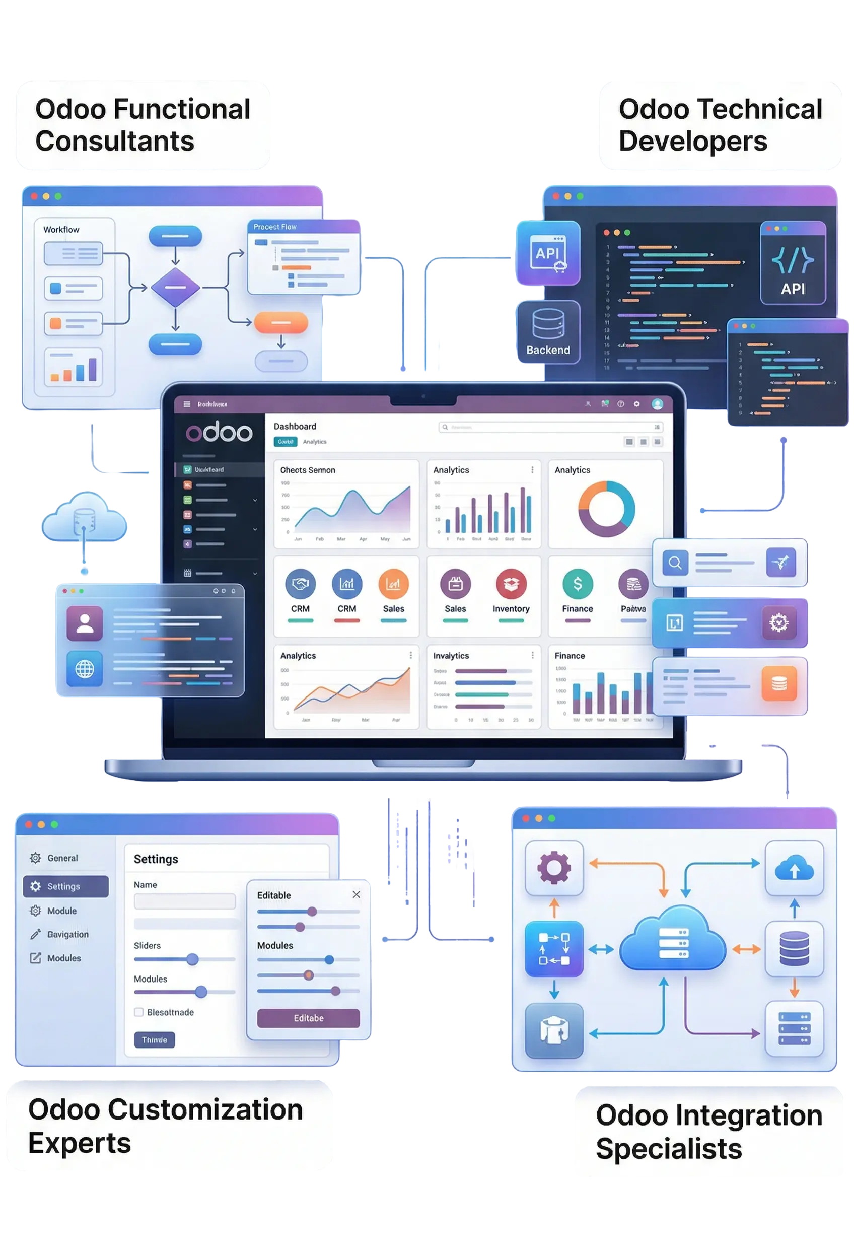 The bridge between business and technology! These experts dive deep into your workflows, understand your processes, and configure Odoo modules so your ERP works exactly the way your business does.