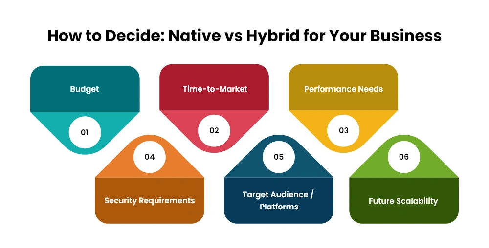 The choice between native and hybrid depends on balancing budget, speed, performance, security, audience reach, and scalability.